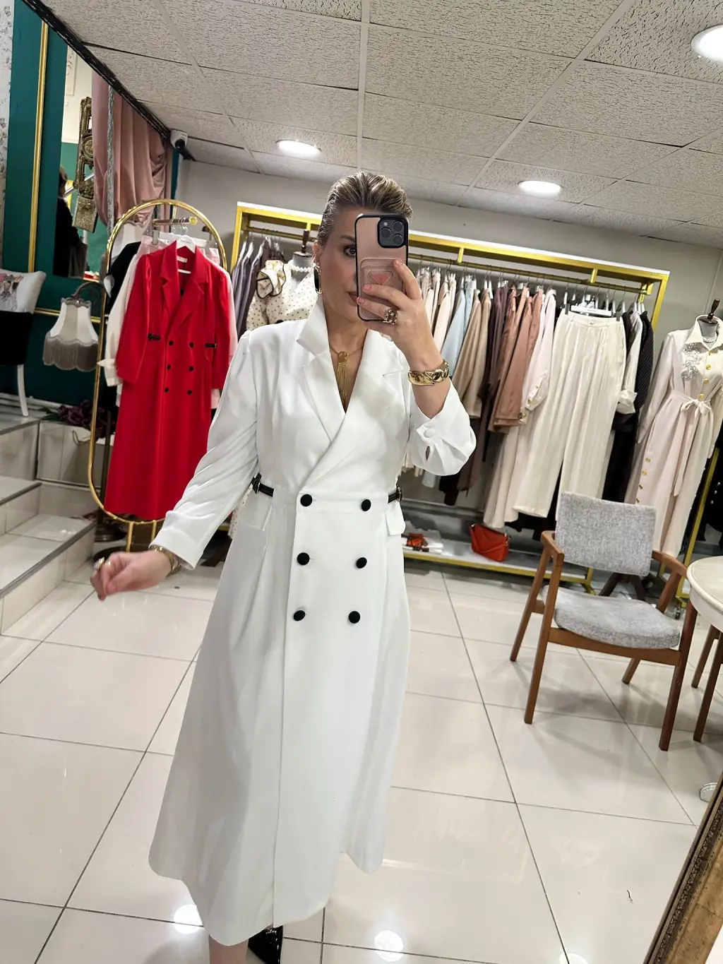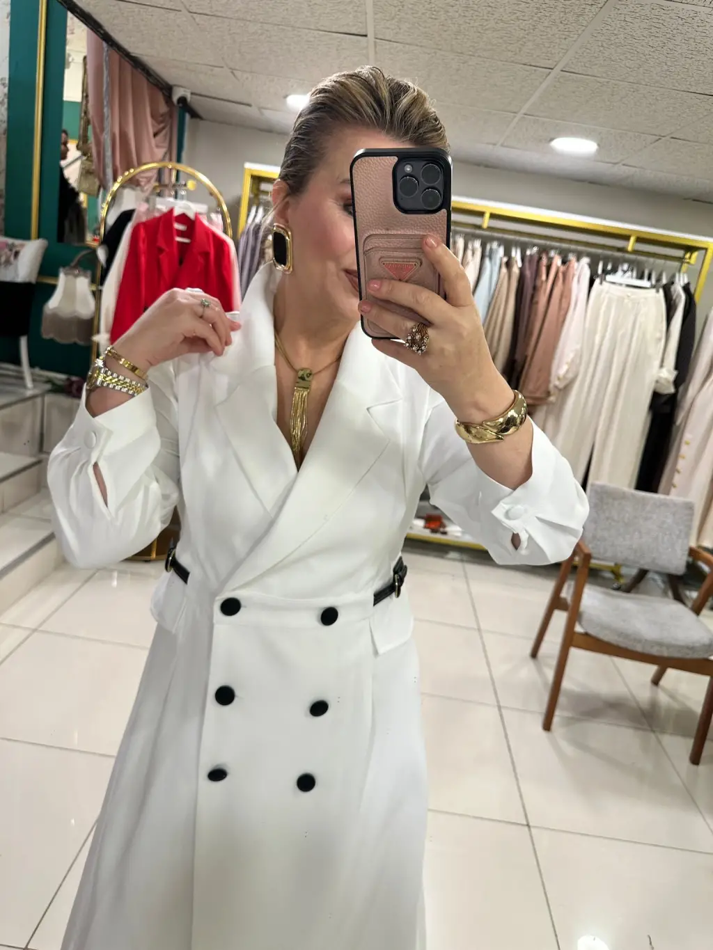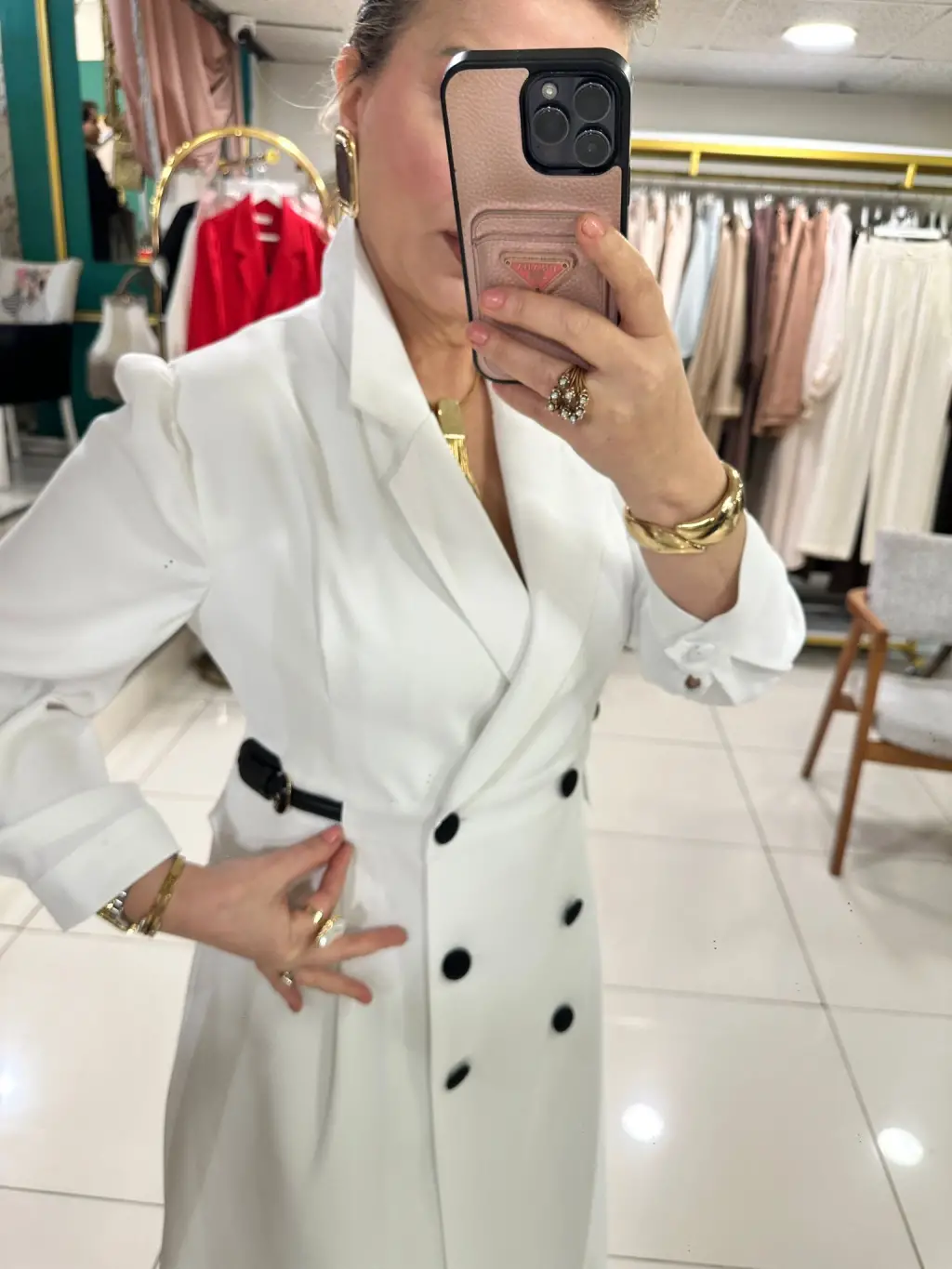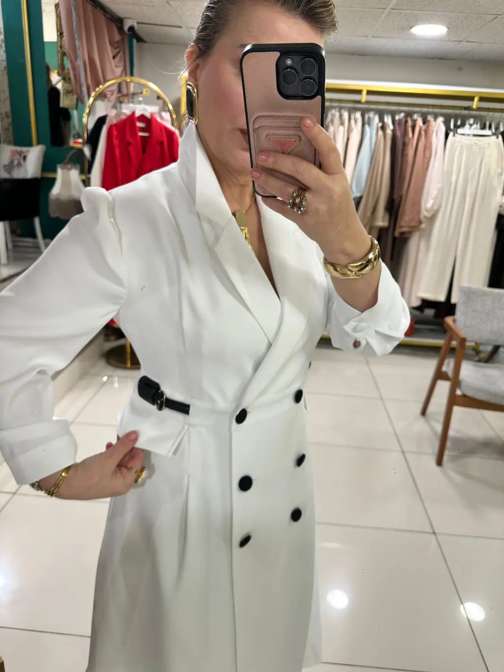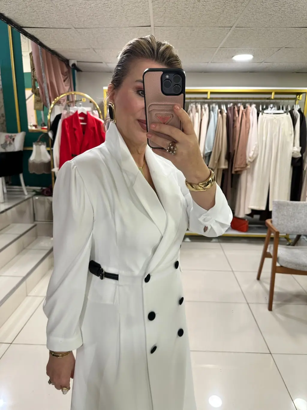 KREM TAŞ DETAY KUŞAKLI ELBİSE